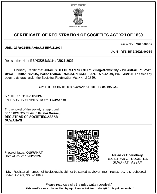 Jibanjyoti Human Society, established in 2021, is a Non-Governmental Organization (NGO) registered under the Societies Registration Act XXI of 1860